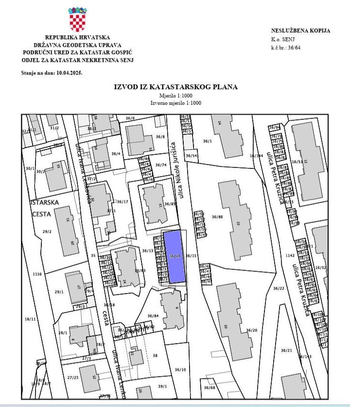 Prodaje se građevinsko zemljište površine 327 m² u Senju, s očaravajućim pogledom na more! Ova rijetka prilika idealna je za investitore i privatne kupce koji traže pametnu lokaciju za garažne i parkirne objekte na više etaža.